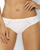 White captivating Elaine thong in a classic design, beautifully presented on any bottom. The thong is made entirely of airy, slightly shimmering tricot knit. The central part of the front decorated with subtle embroidery inserts. Lower leg line finished with decorative tape. Beautiful satin bow in the middle.