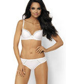 White captivating Elaine thong in a classic design, beautifully presented on any bottom. The thong is made entirely of airy, slightly shimmering tricot knit. The central part of the front decorated with subtle embroidery inserts. Lower leg line finished with decorative tape. Beautiful satin bow in the middle.