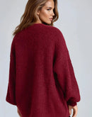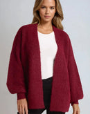 Wine Wool Blend Balloon Sleeve Knitted Cardigan