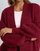 Wrap yourself in cozy elegance with the Aftershock London Wool Blend Balloon Sleeve Knitted Cardigan in a rich wine hue. The long balloon sleeves and open front design create a relaxed fit, perfect for layering during chilly days. Whether you're enjoying a casual day out or curling up at home, this cardigan adds a touch of style and warmth to any outfit.